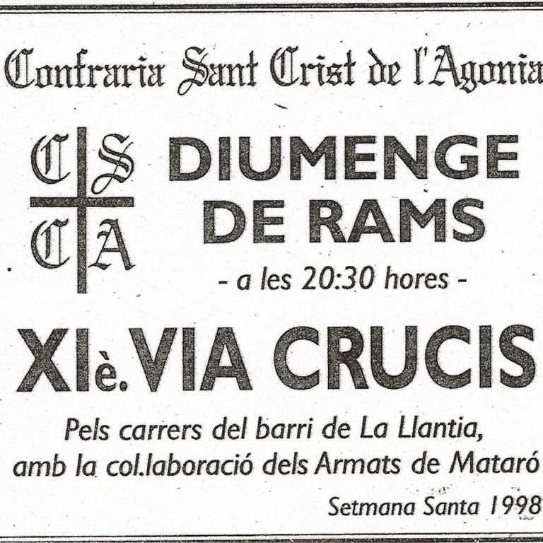 En el Domingo de Ramos del año 1998, en el Vía Crucis que organiza nuestra Cofradía por las calles del Barrio de la Llántia, participaron “els Armats de Mataró”. Esta fue la primera vez que “els Armats” participaban en una salida de otra Cofradía. Para nosotros supuso una verdadera satisfacción.