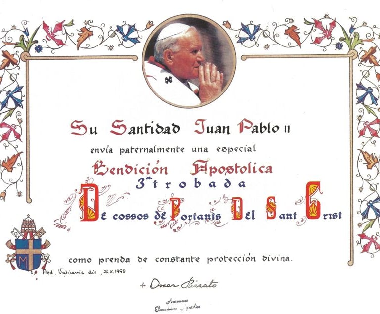 Especial relieve tuvo el recordatorio con la Bendición Apostólica de su Santidad Juan Pablo II, para todas las personas presentes en la “III Trobada de Cossos de Portants del Sant Crist de tot Catalunya”.