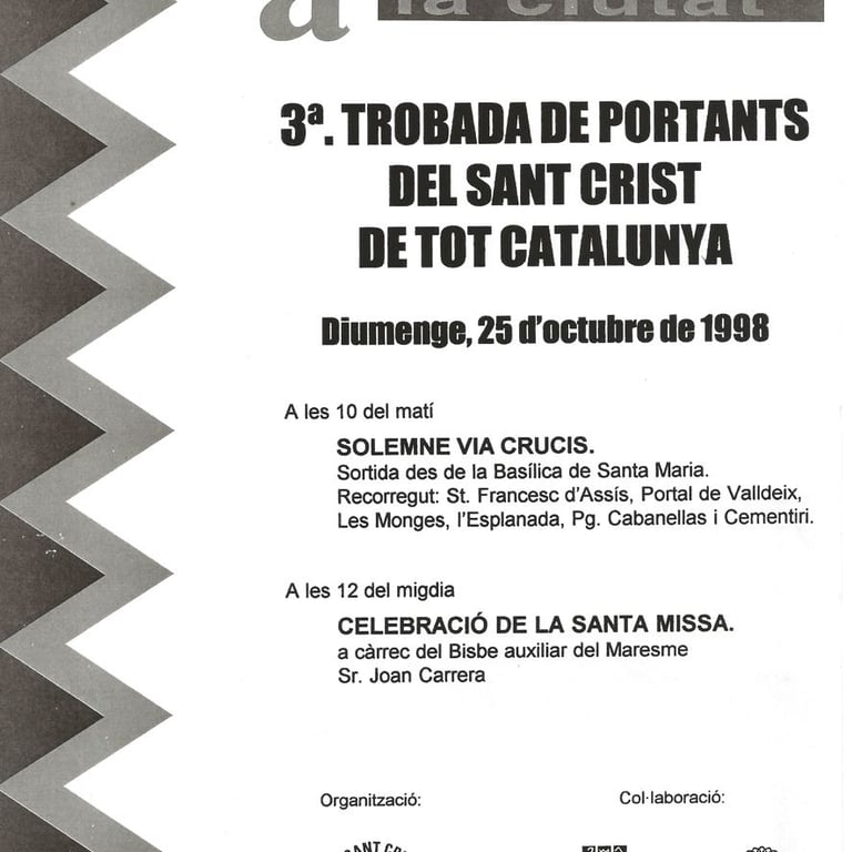 El día 25 de Octubre de 1998 organizamos aquí en Mataró, la “III Trobada de Cossos de portants del Sant Crist de tot Catalunya”. En la anterior Trobada o sea la II efectuada en Vic, fuimos designados por sorteo entre todos los “cossos de portants” allí presentes.